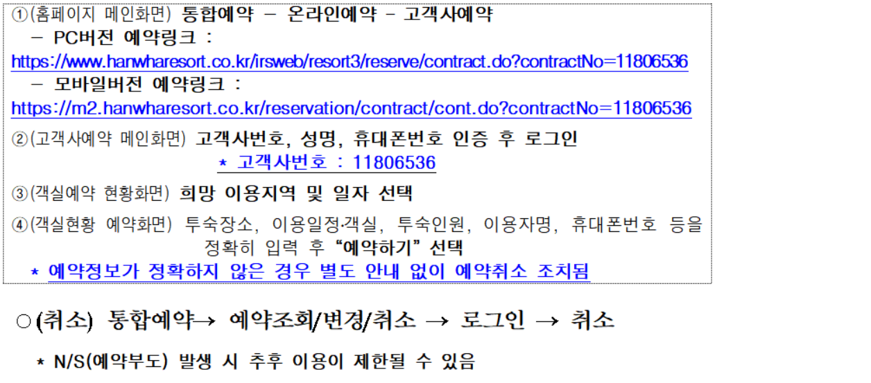 - 객실은 콘도회원권 소유자에게 우선 배정 후 빈 객실이 있을 경우 예약이 가능하므로, 이용이 어려울 수 있음.특히 성수기·주말·연휴의 경우 예약에 어려움이 있음
