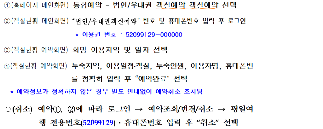 * 성수기의 경우도 잔여 객실이 있을 경우 이용인원이 많은 관계로 예약이 어려울 수 있음