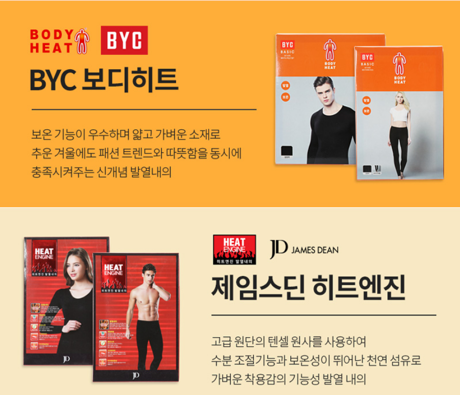 2) BYC 보디히트 남성 여성 내복 세트 발열 내의 바지 겨울 남자 여자 빅사이즈 순면 기모 타이즈 히트텍 상의